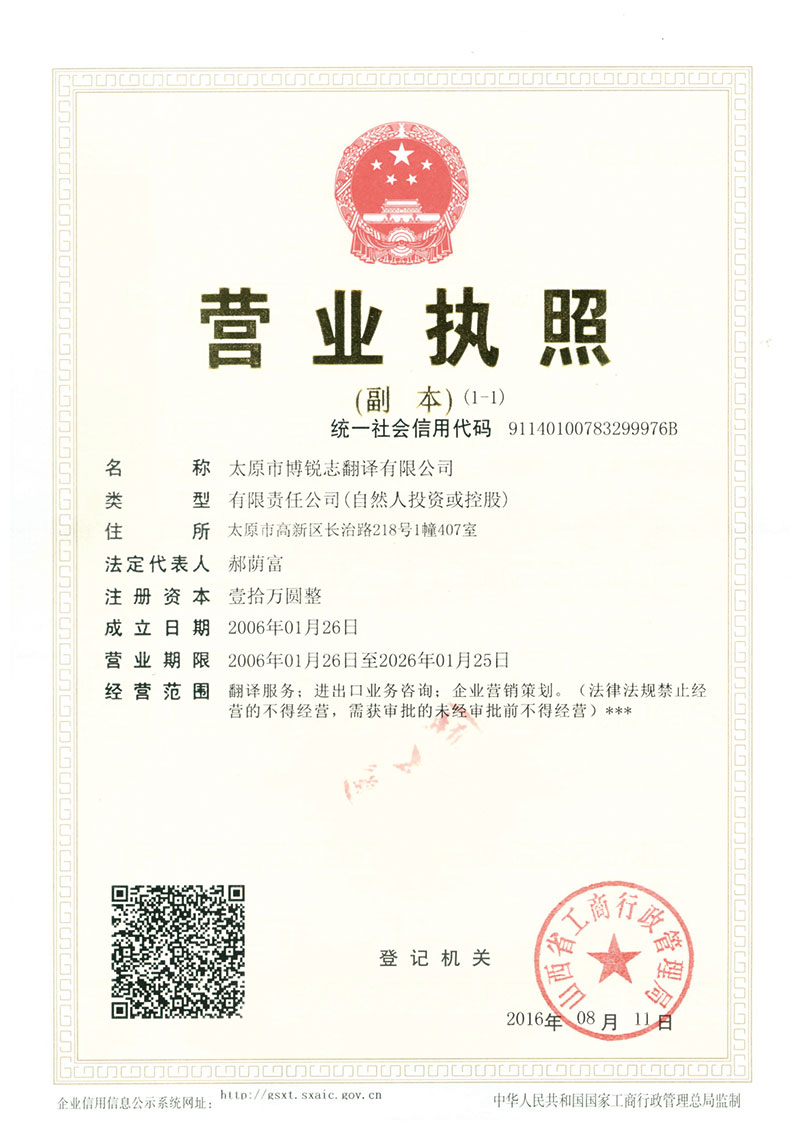 太原市博銳志翻譯有限公司留英市場營銷碩士郝宇云先生于2006年創(chuàng)辦,公司名稱由英文單詞Bridge音譯而來,正如其意,太原市博銳志公司就是要以專業(yè)的知識、誠心誠意的服務(wù)態(tài)度為客戶打造一座跨越語言障礙的橋梁,并提供切實(shí)可行的解決方案。博銳志翻譯公司服務(wù)內(nèi)容涵蓋各類證件翻譯、各種外語文書翻譯、網(wǎng)站頁面翻譯、市場調(diào)研、海外企業(yè)信用調(diào)查、企業(yè)市場營銷戰(zhàn)略咨詢、市場營銷項(xiàng)目策劃等。為回報(bào)社會,由股東出資10000元人民幣創(chuàng)立蔭富助學(xué)基金,并將公司年收入的1%作為此基金的補(bǔ)充來幫助那些學(xué)習(xí)****但家境貧困的學(xué)生。